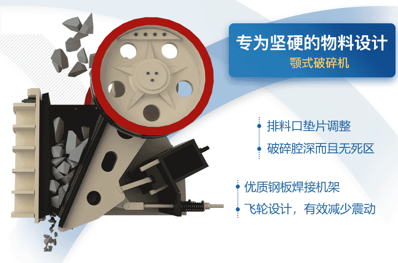 顎式破碎機(jī),有”碎石先鋒“之稱,常用來作初碎作業(yè)。它將開采的大塊礦石破碎成較小的粒度,破碎力大、工作可靠、操作維修方便,是礦山砂石破碎的主要設(shè)備。